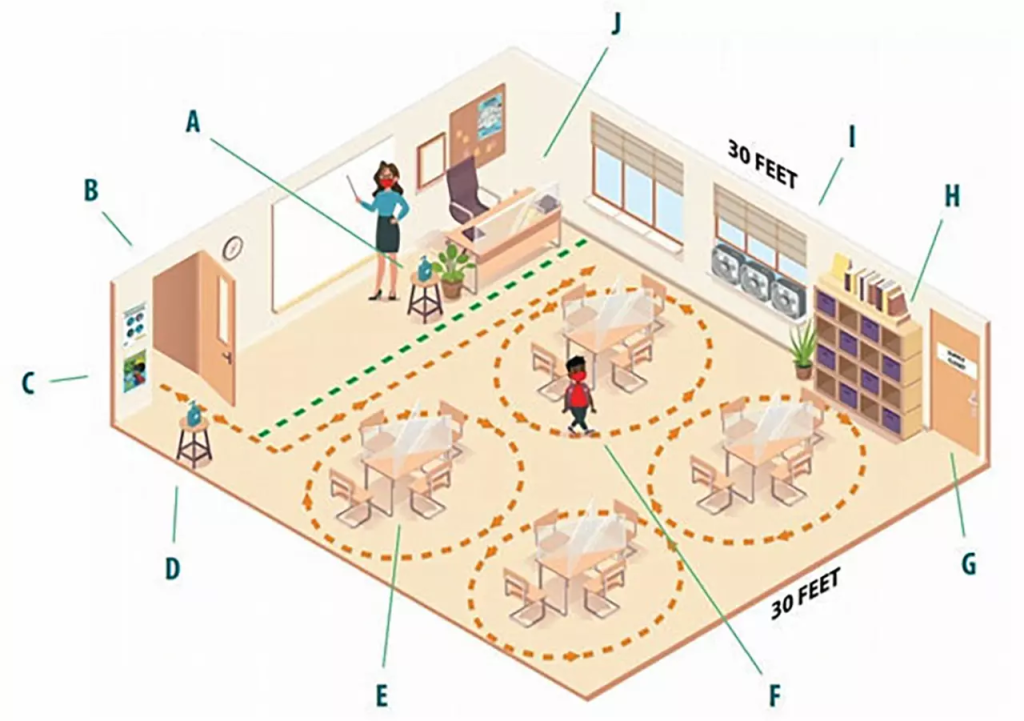 สาม…การนั่งเรียนควรนั่งห่างกัน อย่างน้อย 1-2 เมตร เข้าใจง่ายๆ ว่า…พื้นที่อย่างน้อย 1 ตารางเมตรต่อ 1 คน และแนะนำให้หันหน้าไปด้านเดียวกันทุกคน
