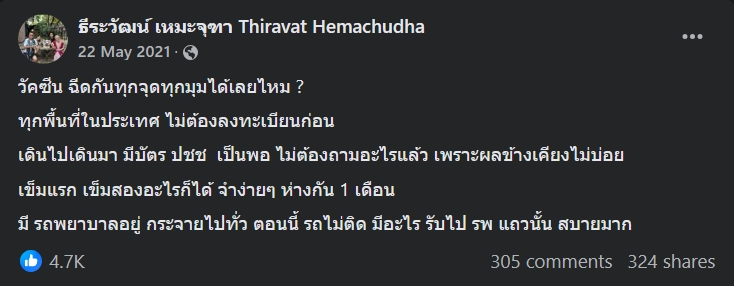 ผู้โพสต์ระบุข้อความว่า “วัคซีน ฉีดกันทุกจุดทุกมุมได้เลยไหม? ทุกพื้นที่ในประเทศ ไม่ต้องลงทะเบียนก่อน เดินไปเดินมา มีบัตรประชาชนเป็นพอไม่ต้องถามอะไรแล้วเพราะผลข้างเคียงไม่บ่อย เข็มแรก เข็มสองอะไรก็ได้ จำง่ายๆ ห่างกัน 1 เดือน มีรถพยาบาลอยู่กระจายไปทั่ว ตอนนี้รถไม่ติด มีอะไรรับไป รพ.แถวนั้นสบายมาก”